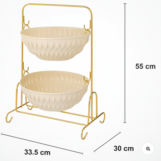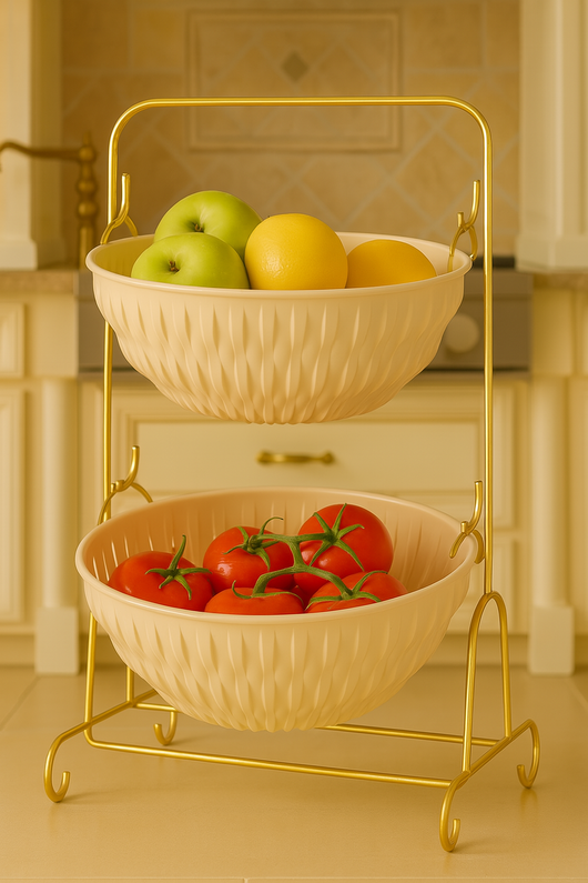 Elevate your kitchen and pantry organization with this 2-tier fruit and vegetable storage basket featuring a sleek gold metal stand. Designed for efficient countertop use, it maximizes space while keeping produce visible and accessible. The sturdy metal frame ensures durability, while the elegant gold finish adds a refined touch to your décor. Ideal for separating fruits and vegetables, this organizer promotes better air circulation to help keep your produce fresh longer. A practical and stylish solution for maintaining a tidy and attractive kitchen environment.