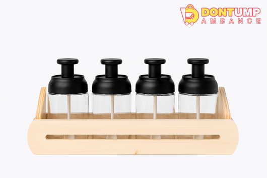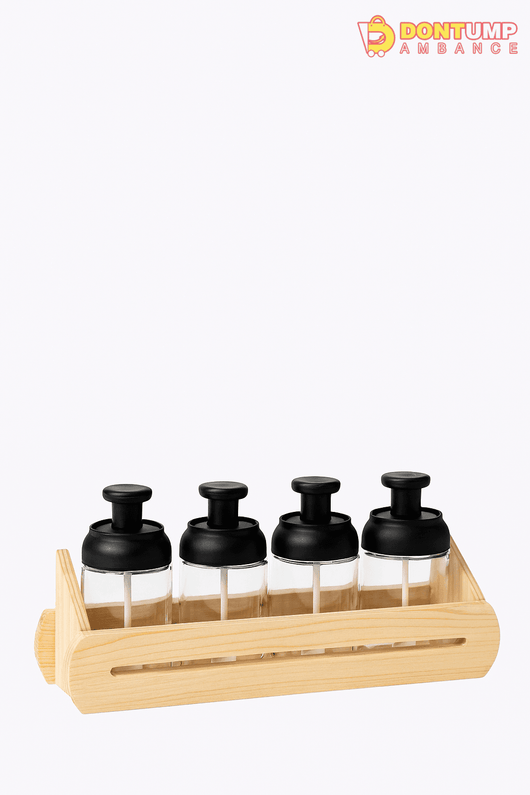 Organize your kitchen efficiently with this 4-piece glass spice jar set featuring sleek black lids and a sturdy wooden holder. Crafted for durability and ease of use, each jar provides a clear view of your spices, ensuring quick identification and freshness. The wooden holder keeps your spices neatly arranged and accessible, optimizing countertop or cabinet space. Ideal for maintaining an orderly kitchen, this set combines functionality with a minimalist design suited for any culinary environment.