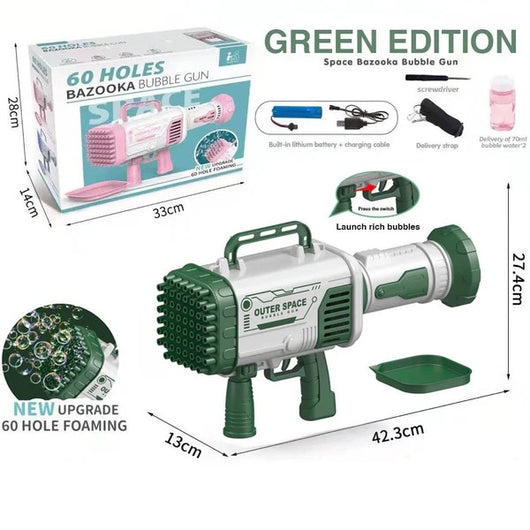 Experience endless bubble fun with the 60-Hole Rocket Launcher Bubbles Gun, designed for powerful and continuous bubble streams. Its 60-hole nozzle ensures a vast number of bubbles are produced simultaneously, creating an impressive visual effect perfect for events, parties, or outdoor play. Ergonomically crafted for easy handling, this bubble gun offers durable performance with smooth operation, making it ideal for bubble enthusiasts seeking professional-quality results. Elevate your bubble experience with this innovative launcher that delivers both volume and reliability.