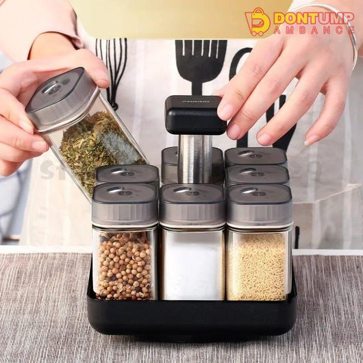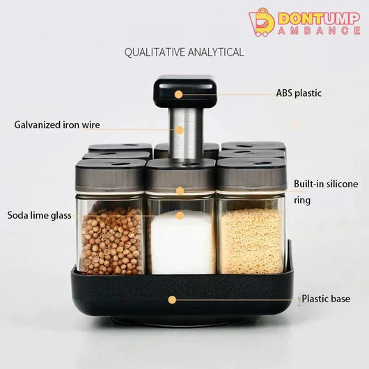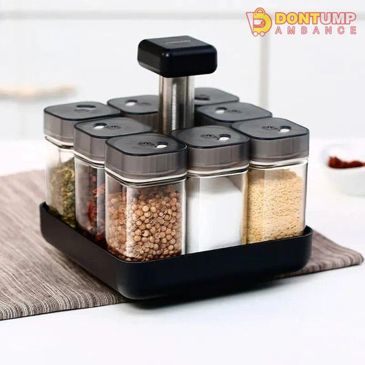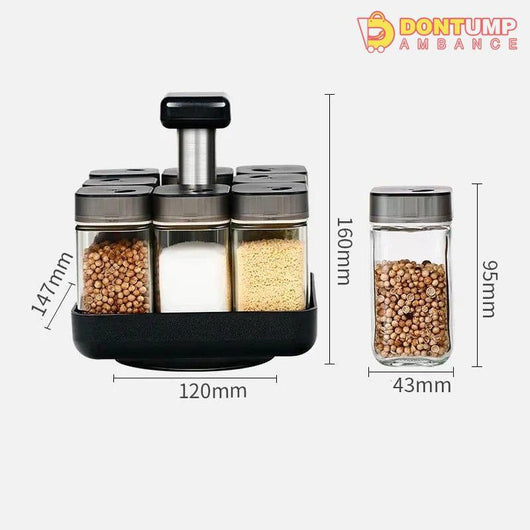 9 pcs. consists of: 1x ABS plastic swivel stand with chrome-plated handle, 8 x glass condiment with silicone seal and plastic lid with 100 ml volume. The spice pots have versatile use and this is based on the lid, which is equipped with 3 different openings – small, larger and universal. Seasoners are suitable especially for finely ground spices, but also for larger types of spices and for spices such as clove and whole pepper. Only the glass parts of the spice rack can be placed in the dishwasher.