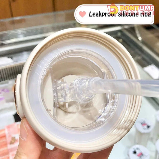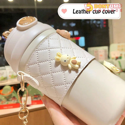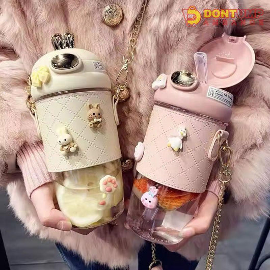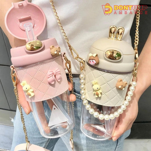 Cute Rabbit Ear Plastic Water Bottles With Leather Sleeve Straw And Strap 500ml
