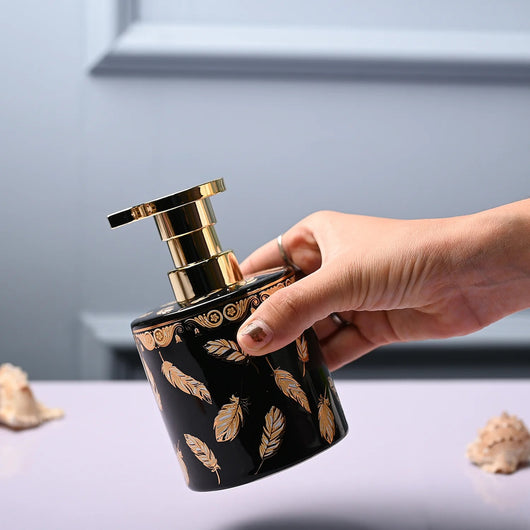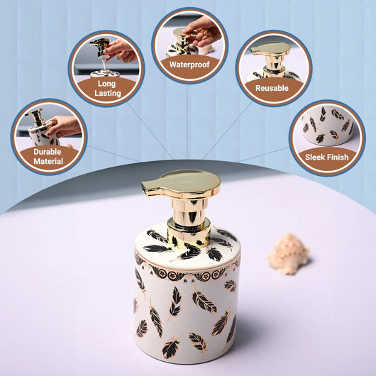 Elevate your bathroom or kitchen with this Decorative Cream and Gold Soap Pump. Crafted with a sleek cream body accented by elegant gold detailing, it combines style and functionality seamlessly. Designed for smooth dispensing, this pump adds a touch of luxury to your daily routine while keeping soap conveniently accessible. Its timeless color palette complements a variety of decor styles, making it a practical yet sophisticated addition to any space.