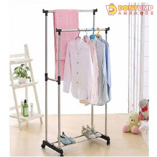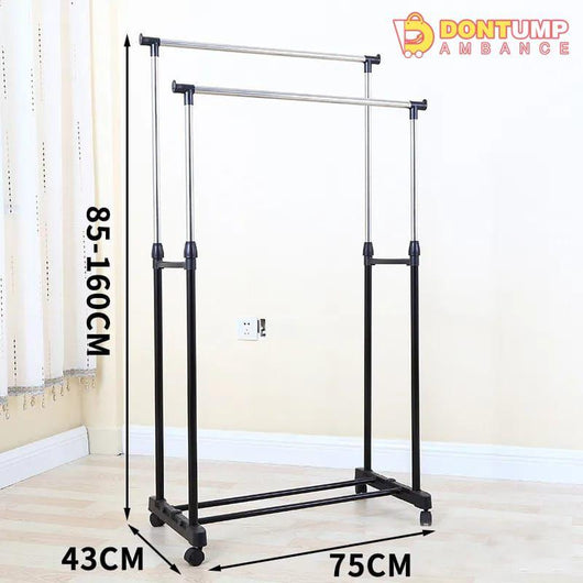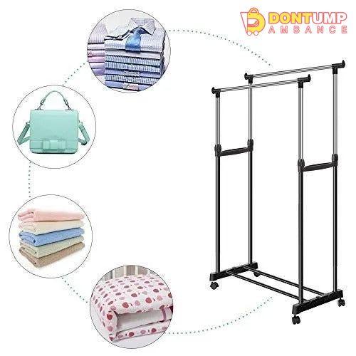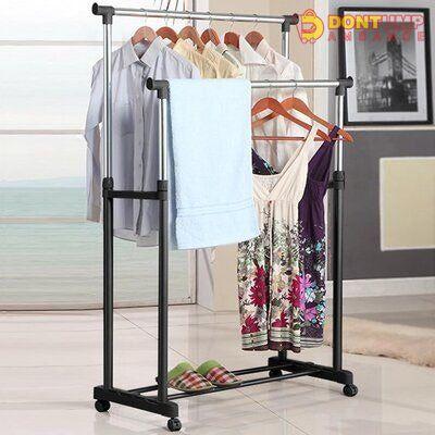 - The stainless Steel Premium Double pole construction enables the rack to be used both indoors and outdoors, in dry or wet environments, double pole With 4 wheels, this clothing rack is easy rolling from room to room to get your clothes at hand.