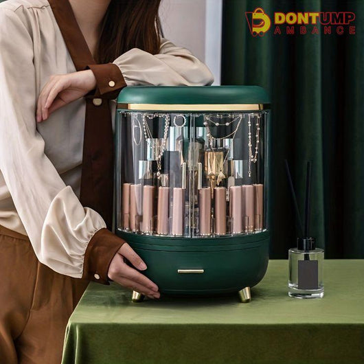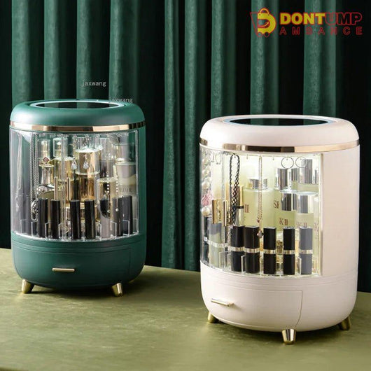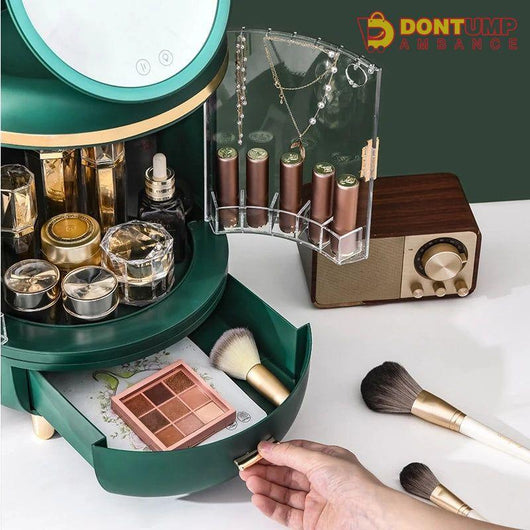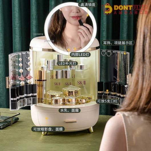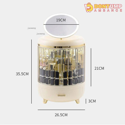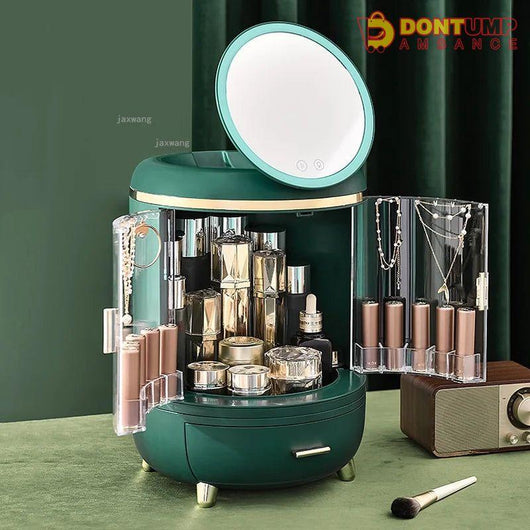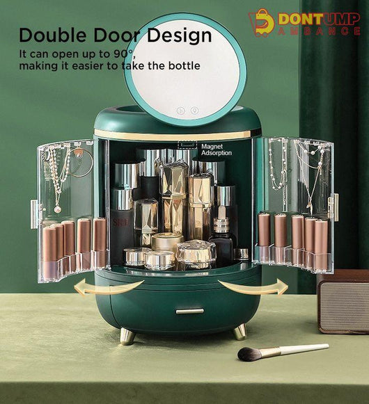 This cosmetic organizer features dual doors and an LED mirror for efficient and organized makeup storage. The built-in mirror adds convenient functionality for everyday use. Keep your cosmetics in one place and easily accessible with this sleek organizer.