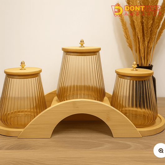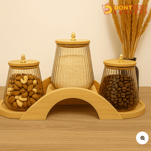 This elegant 3-piece glass storage jar set features clear, durable containers paired with a stylish bamboo stand, perfect for organizing nuts, rice, coffee beans, and other dry goods. The airtight lids help maintain freshness while the bamboo stand offers a compact, eco-friendly storage solution that enhances any kitchen countertop with a clean, modern look. Ideal for those seeking both functionality and aesthetic appeal in their pantry organization.