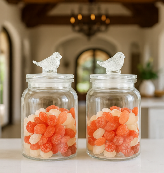 Enhance your kitchen organization with this set of two elegant glass candy storage jars, each topped with a charming bird-shaped lid. These decorative containers combine functionality with aesthetic appeal, providing a stylish way to store sweets, snacks, or small kitchen essentials. Crafted from clear glass, they allow easy visibility of contents while the secure lids help maintain freshness. Ideal for adding a refined touch to your countertop or pantry.