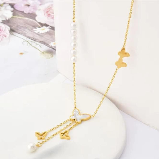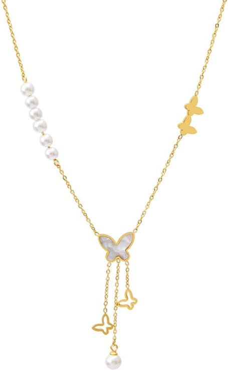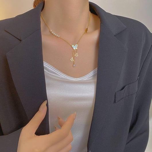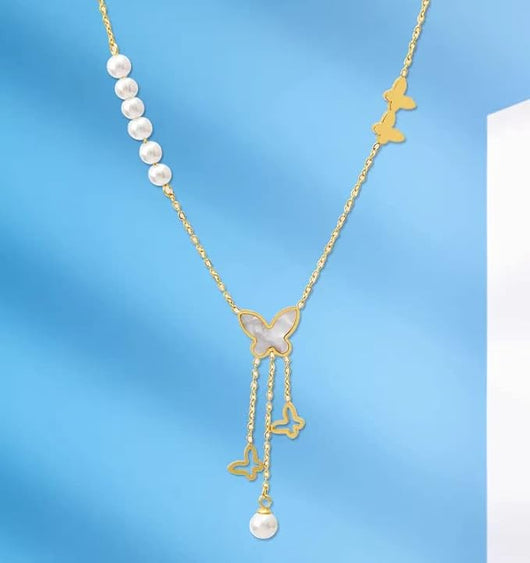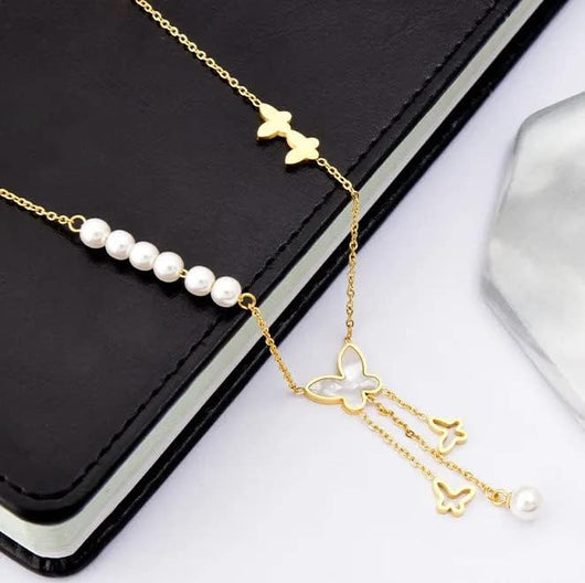 This elegant gold butterfly pendant necklace features delicate pearls and a dainty layered chain, offering a refined accessory perfect for women and girls. Its lightweight design ensures comfortable wear throughout the day, while the butterfly motif adds a touch of timeless charm. Ideal for layering or as a standalone piece, it complements both casual and formal styles with subtle sophistication.