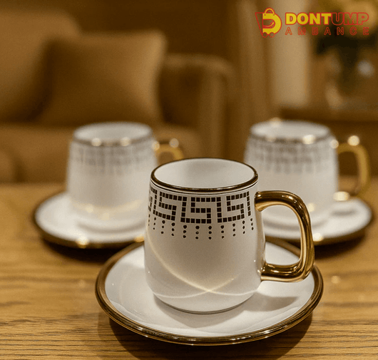 Elevate your coffee experience with this Elegant Greek Key Porcelain Coffee Cup Set, featuring a refined gold handle that adds a touch of luxury to every sip. Crafted from high-quality porcelain, each cup showcases the classic Greek key pattern, blending timeless design with durable craftsmanship. Perfect for sophisticated gatherings or daily indulgence, this set combines aesthetic appeal with practical elegance.