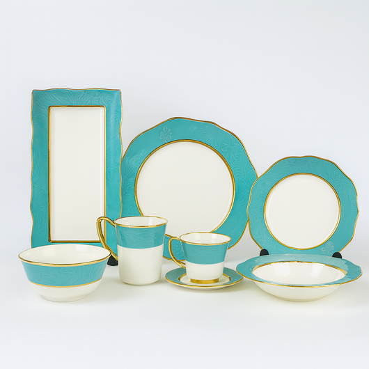 Elevate your dining experience with this Elegant Turquoise & Gold Porcelain Dinnerware Set. Featuring seven expertly crafted pieces, each item combines refined turquoise hues with subtle gold accents to create a sophisticated table setting. Made from durable porcelain, this set offers both elegance and everyday usability, perfectly suited for formal dinners or special occasions. Its timeless design enhances any décor, bringing a touch of luxury and expert craftsmanship to your meals.