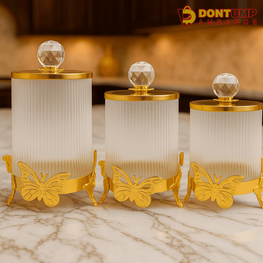 Frosted Glass Storage Jar Set with Gold Butterfly Base – Set of 3 Elegant Canisters