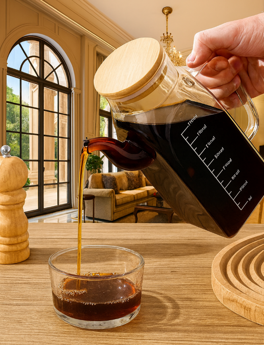 This 1-liter glass measuring pitcher features a heat-resistant design ideal for coffee, juice, and other beverages. Its clear glass body allows precise measurement, while the wooden lid adds a natural touch and helps maintain freshness. Durable and practical, this carafe combines functionality with elegant simplicity for expert use in any kitchen or café setting.