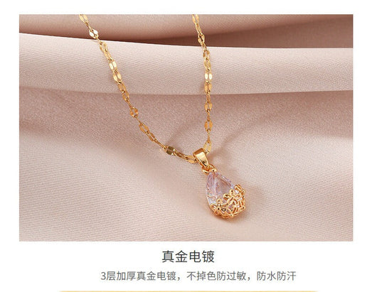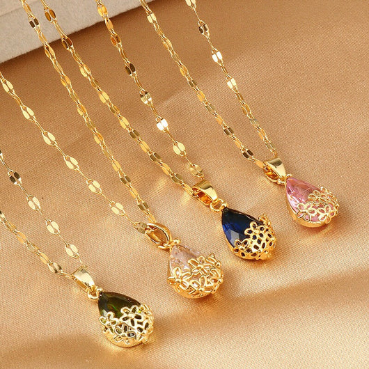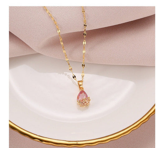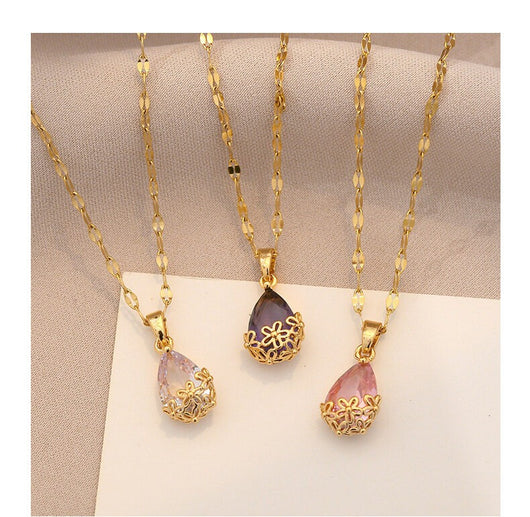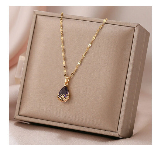 This gold plated stainless steel necklace features a striking deep purple teardrop pendant, combining durability with sophisticated elegance. The stainless steel base ensures long-lasting wear resistant to tarnish, while the gold plating adds a refined finish that complements the rich purple hue. Perfect for both everyday wear and special occasions, this pendant necklace offers a timeless accent that enhances any outfit with subtle luxury and expert craftsmanship.