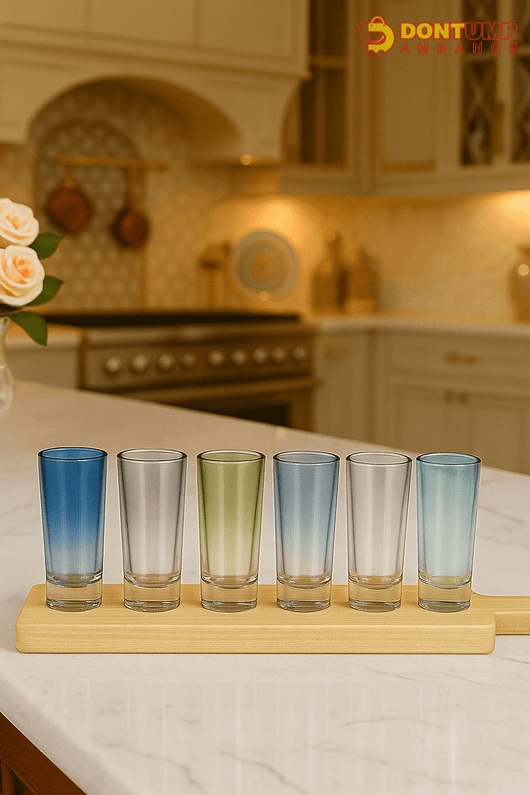 Gradient Glass Tumbler Set on Wooden Tray – Elegant Kitchen Decor"