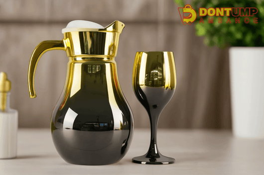 Elevate your serving experience with this Luxury Black & Gold Thermos Jug paired with a matching wine glass. Crafted for both style and functionality, the thermos jug maintains your beverages at the ideal temperature while its sleek black and gold design adds a sophisticated touch to any setting. The complementary wine glass enhances the presentation, making this set perfect for refined gatherings or personal indulgence. Designed for durability and elegance, it combines practical insulation with a luxurious aesthetic.
