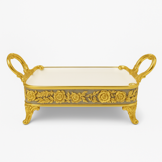 Elevate your serving experience with this Luxury Gold Floral Serving Tray, featuring intricate floral designs and ornate handles. Crafted for both elegance and durability, it offers a refined presentation for special occasions or everyday use. The detailed craftsmanship ensures a sophisticated touch, making it an essential piece for hosting with style and grace.