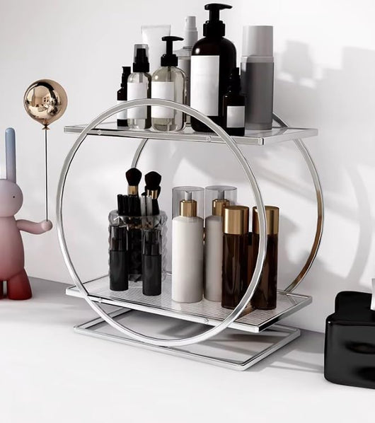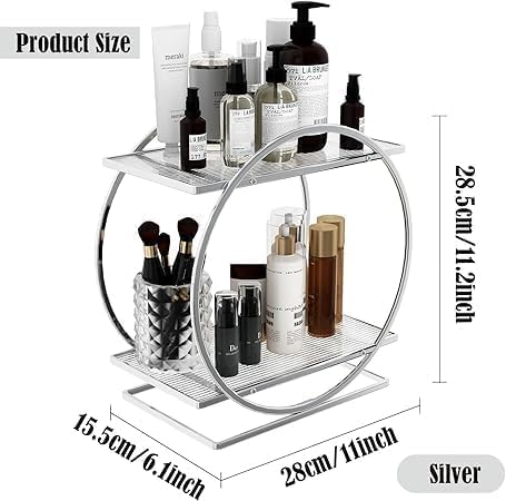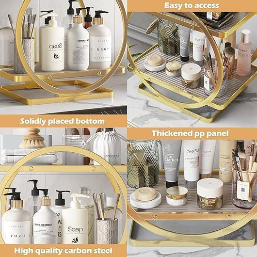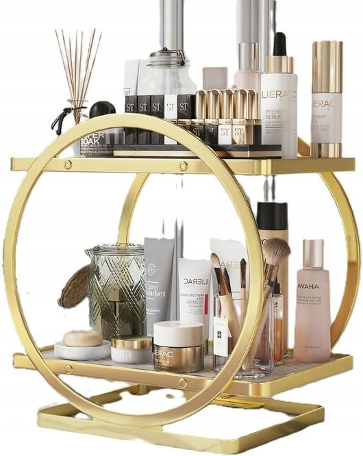 Elevate your bathroom or vanity space with this Luxury Golden Metal Round Shelf. Featuring a double-layer design, it offers ample storage for cosmetics and perfumes, keeping your essentials organized and easily accessible. Crafted with durable metal and a sleek golden finish, this shelf combines functionality with a sophisticated look, enhancing your décor while maintaining order. Ideal for professionals and enthusiasts seeking a refined yet practical storage solution.