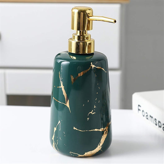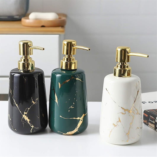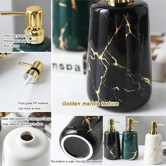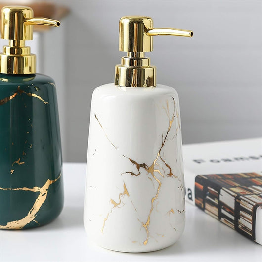 Elevate your bathroom or kitchen with this Luxury Marble Pattern Ceramic Soap Dispenser featuring a sleek gold pump. Crafted from durable ceramic, its sophisticated marble design adds a timeless elegance while resisting wear. The gold pump ensures smooth, controlled dispensing, combining style with practical functionality. Ideal for those seeking a refined and hygienic way to store and use liquid soap.
