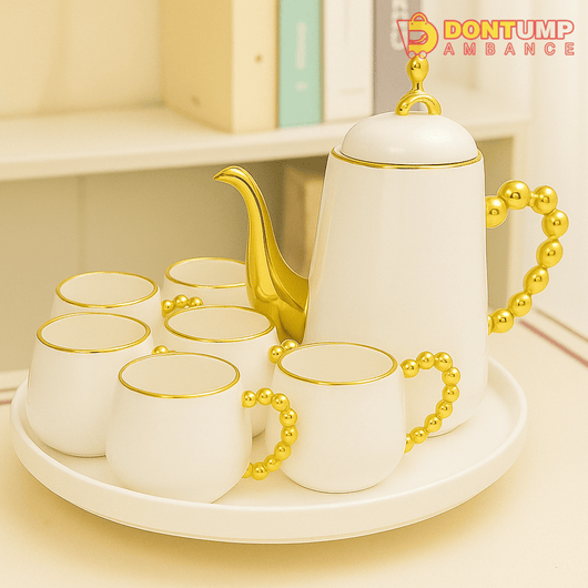 Luxury White & Gold Ceramic Tea Set – 7-Piece Elegant Serving Set with Decorative Handles