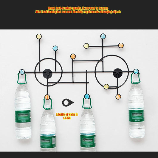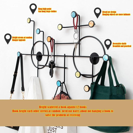 This wall coat rack features a modern bicycle-inspired design, seamlessly blending form and function. Crafted to resemble a sleek bicycle frame, it offers multiple colorful hooks that provide organized, accessible storage for coats, hats, and bags. Its distinctive shape makes it a striking statement piece while maximizing wall space efficiency in any contemporary setting.