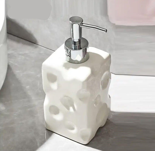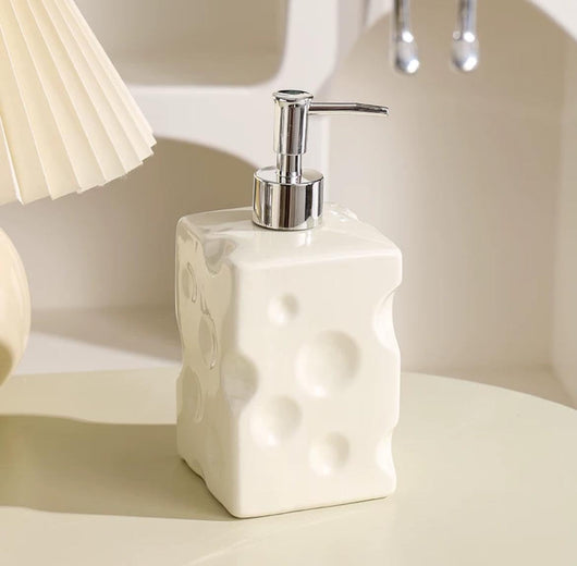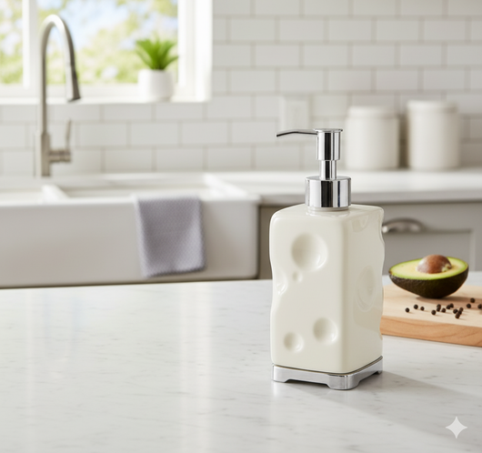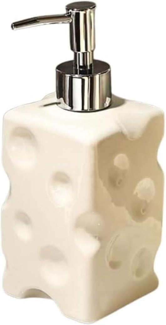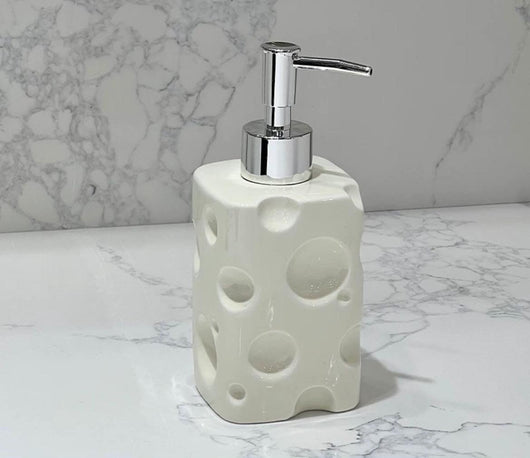 It features a sleek, chrome-plated pump head and a sturdy, square chrome base, giving a modern, premium contrast to the fun, creamy-white body. Perfect for holding hand soap, dish soap, or lotion, it's the ultimate conversation starter and a must-have accessory for anyone who loves unique home decor