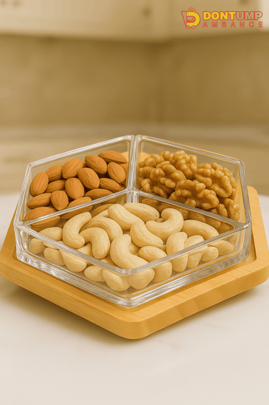 Elevate your kitchen organization with this premium 3-section acrylic dry fruit tray featuring a sturdy wooden base. Designed for both style and functionality, its clear acrylic compartments allow easy visibility and separation of your favorite dry fruits or snacks. The wooden base adds durability and a touch of natural elegance, making it an ideal centerpiece for any dining or serving area. Perfect for maintaining freshness while showcasing your assortment with sophistication.