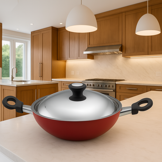 Experience superior cooking with the Premium Non-Stick Deep Frying Kadai featuring a durable red finish and a transparent glass lid. Its high-quality non-stick surface ensures even heat distribution and easy food release, reducing oil usage for healthier frying. The sturdy glass lid allows you to monitor cooking without losing heat or moisture, while the deep design accommodates generous portions. Ideal for expert chefs seeking efficiency and precision in frying, this Kadai combines functionality with elegant aesthetics for your kitchen.