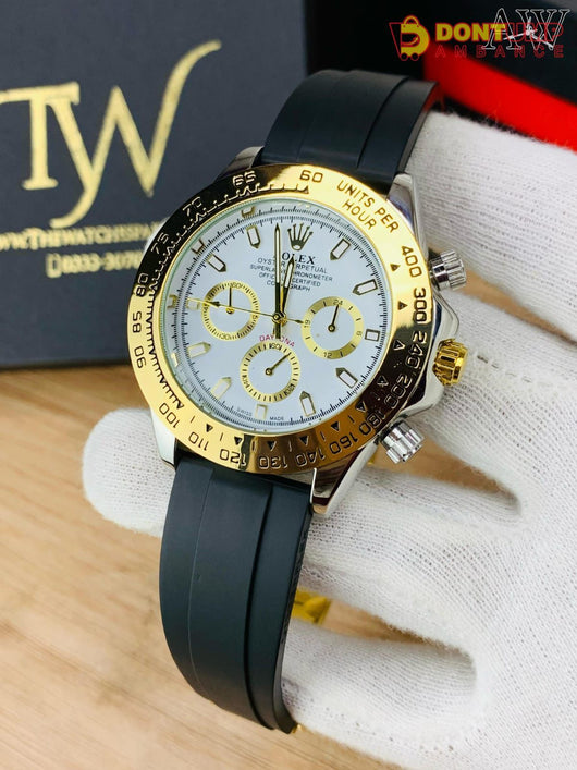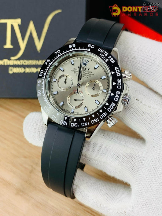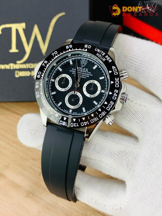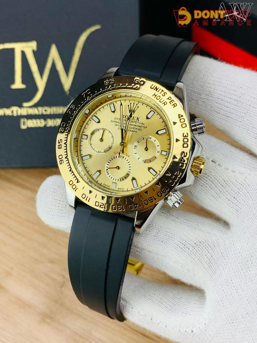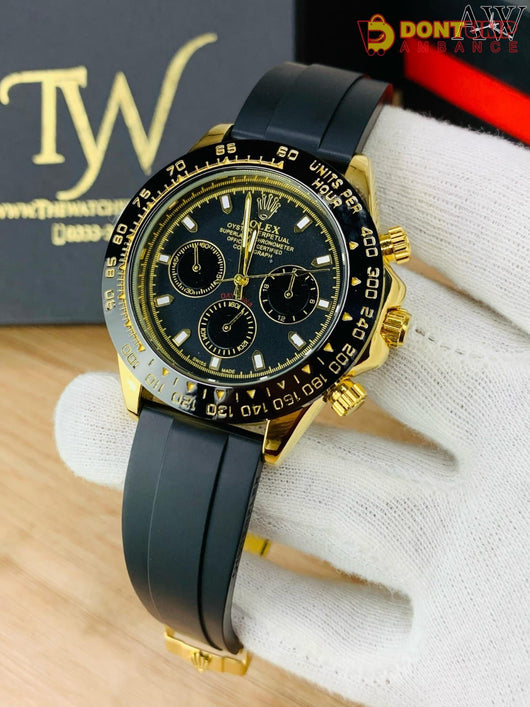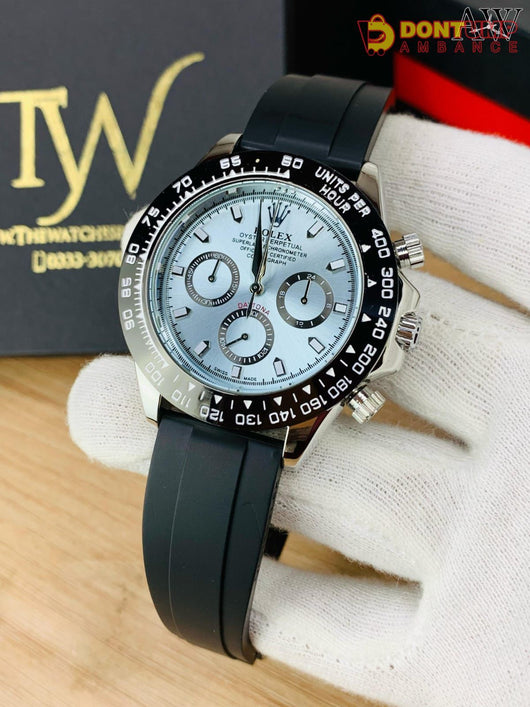 Experience precision and style with the ROLEX Daytona, featuring a fully functional chronograph and date display. Equipped with a master lock for secure wear, this timepiece is available in new attractive colors, combining expert craftsmanship with modern aesthetics. Ideal for those who value both performance and elegance.