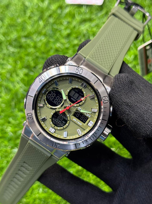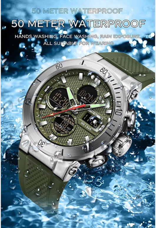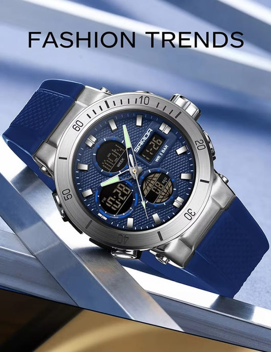 The SANDA New Model 6191 features a clear 13-digit display and dual time functionality, ideal for tracking multiple time zones. Its 5 ATM water resistance ensures durability during everyday activities, while the silicone rubber strap offers comfort and flexibility. Equipped with a stopwatch, alarm, countdown timer, and EL backlight, this watch combines practical features for precise time management and visibility in low light conditions. Perfect for those seeking reliability and versatility in a modern timepiece.