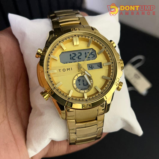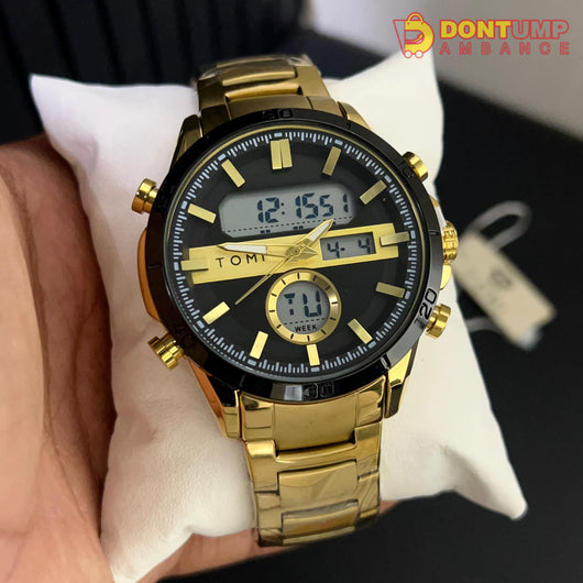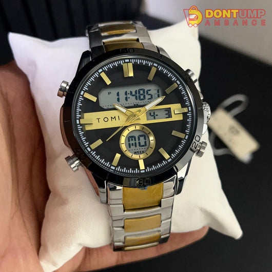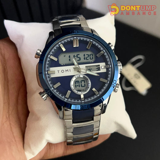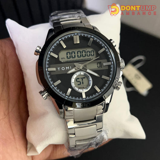 Experience precision and versatility with the TOMI Dual Time Steel Chain Watch. Featuring both analog and digital displays, it offers clear timekeeping in 12/24-hour formats. Crafted with a durable stainless steel chain strap, this watch includes an LED backlight for easy night reading, alarm and stopwatch functions, and a calendar showing date and day. Its robust design is water resistant up to 30 meters and shock resistant, ensuring reliable performance in various conditions. Ideal for those who demand functionality and style in one timepiece.
