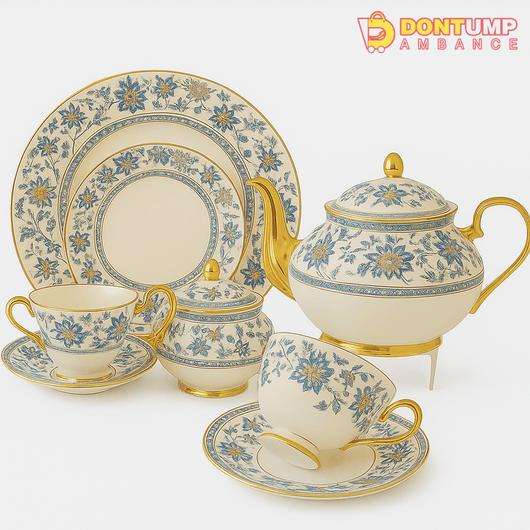 Vintage Floral Porcelain Tea Set with Blue and Gold Detailing – Elegant 15-Piece Fine China Collection