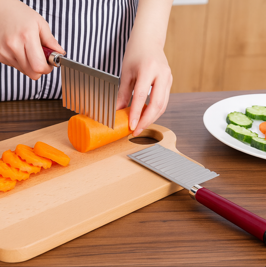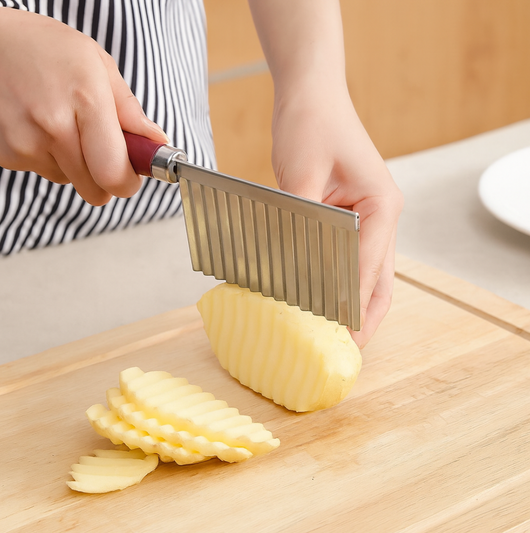 This wavy shaped knife features a uniquely serrated blade designed to enhance cutting precision and efficiency. Its distinctive wave pattern helps maintain sharpness longer and provides cleaner cuts, especially useful for slicing bread, vegetables, and delicate foods. Crafted for expert use, this knife offers superior control and durability, making it an essential tool for professional kitchens and culinary enthusiasts seeking refined performance.